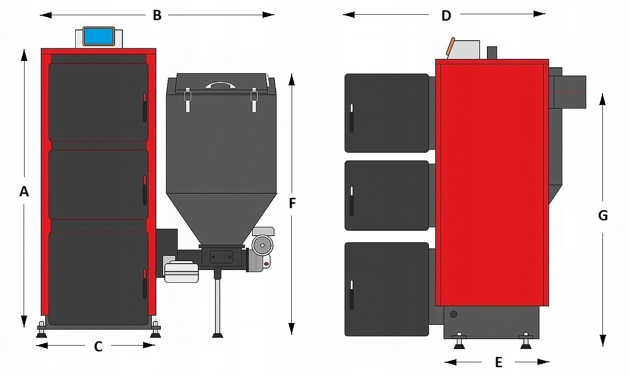 dopuszczalna praca w układzie zamkniętym, kocioł z podajnikiem, podajnik po lewej stronie, podajnik po prawej stronie