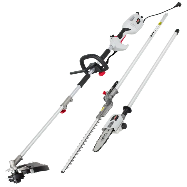 W zestawie znajduje się głowica żyłkowa oraz tarcza trójzębna do wykaszania przerośniętej leżącej trawy. Nożyce do formowania – przycinania wysokich żywopłotów, pilarka – okrzesywarka do obcinania gałęzi.