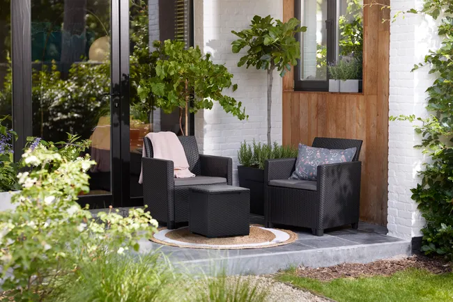 Kompaktowy set Marie ze stolikiem vigo. 2 fotele idealnie odnajdą się w ogrodzie na tarasie jak i na niewielkim balkonie, w zestawie stolik vigo- z funkcją przechowywania- otwierany od góry. System mebli na clik- nie potrzeba wkręcania śrub – co przekłada się na oszczędność czasu.