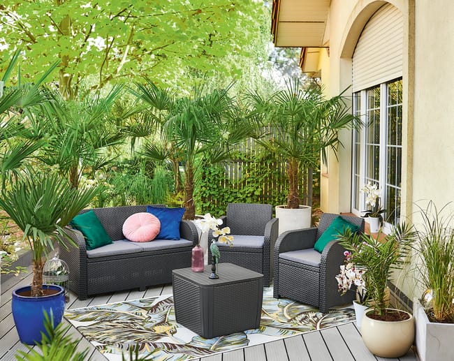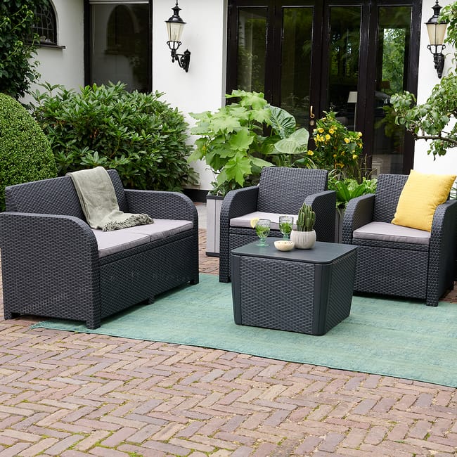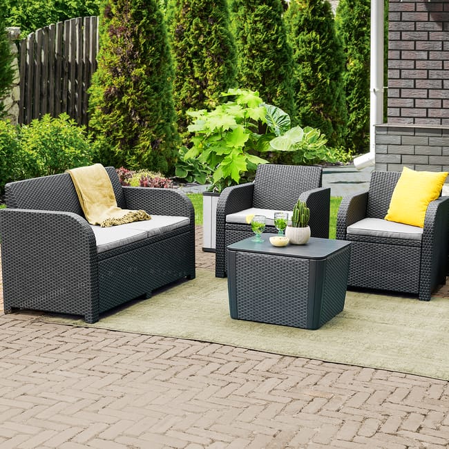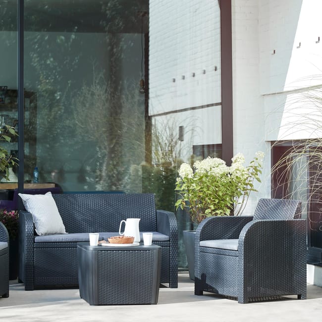 Meble do ogrodu NOVARA Keter pozwolą Ci zrelaksować się na świeżym powietrzu w komfortowych warunkach. Komplet wypoczynkowy składa się z dwuosobowej sofy ogrodowej, dwóch foteli oraz stolika kawowego. Idealny zestaw wypoczynkowy na taras oprócz profilowanych podłokietników i oparć, posiada także miękkie poduszki siedziskowe, które są odporne na mały deszcz lub rozlany napój. Poszczególne elementy zestawu możesz łączyć lub ustawiać osobno w taki sposób, aby odpowiadały Twoim potrzebom.