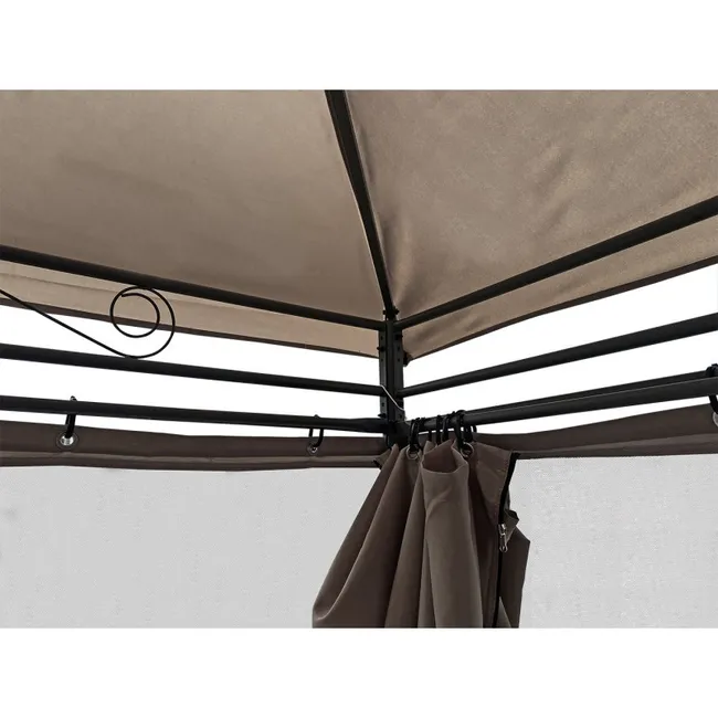 Szary kolor oraz lekka forma sprawiają, że harmonijnie wpasowuje się w każde ogrodowe otoczenie. Przemyślana konstrukcja i solidne wykonanie Pawilon został wyposażony w 6 niezależnych ścianek, dzięki czemu można w pełni osłonić wnętrze, tworząc przytulną, zacienioną przestrzeń z dala od słońca i wiatru. Dach z wywietrznikiem (tzw. luftem) zapewnia swobodną cyrkulację powietrza, a osłonięcie moskitierą skutecznie chroni przed owadami. Całość opiera się na metalowym stelażu, zaprojektowanym z myślą o stabilności i trwałości. Rury wyposażone w system blokady „klik” umożliwiają szybki i bezpieczny montaż, gwarantując sztywność całej konstrukcji. Materiały odporne na warunki atmosferyczne Daszek wykonano z wytrzymałego poliestru o gramaturze 160 g – skutecznie chroni przed słońcem i lekkim deszczem. Ścianki uszyte są z poliestru 140 g – są odporne, estetyczne i równie skutecznie osłaniają przed słońcem jak dach. Dodatkowe otwory w daszku umożliwiają odpływ wody, co zwiększa funkcjonalność pawilonu nawet przy zmiennych warunkach pogodowych. Uwaga: w przypadku gwałtownych zjawisk atmosferycznych zaleca się złożenie pawilonu i zabezpieczenie go przed uszkodzeniem.