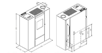 - Odległość od łatwopalnych powierzchni: z boku: 25 cm – z tyłu: 25 cm – od przodu: 150 cm